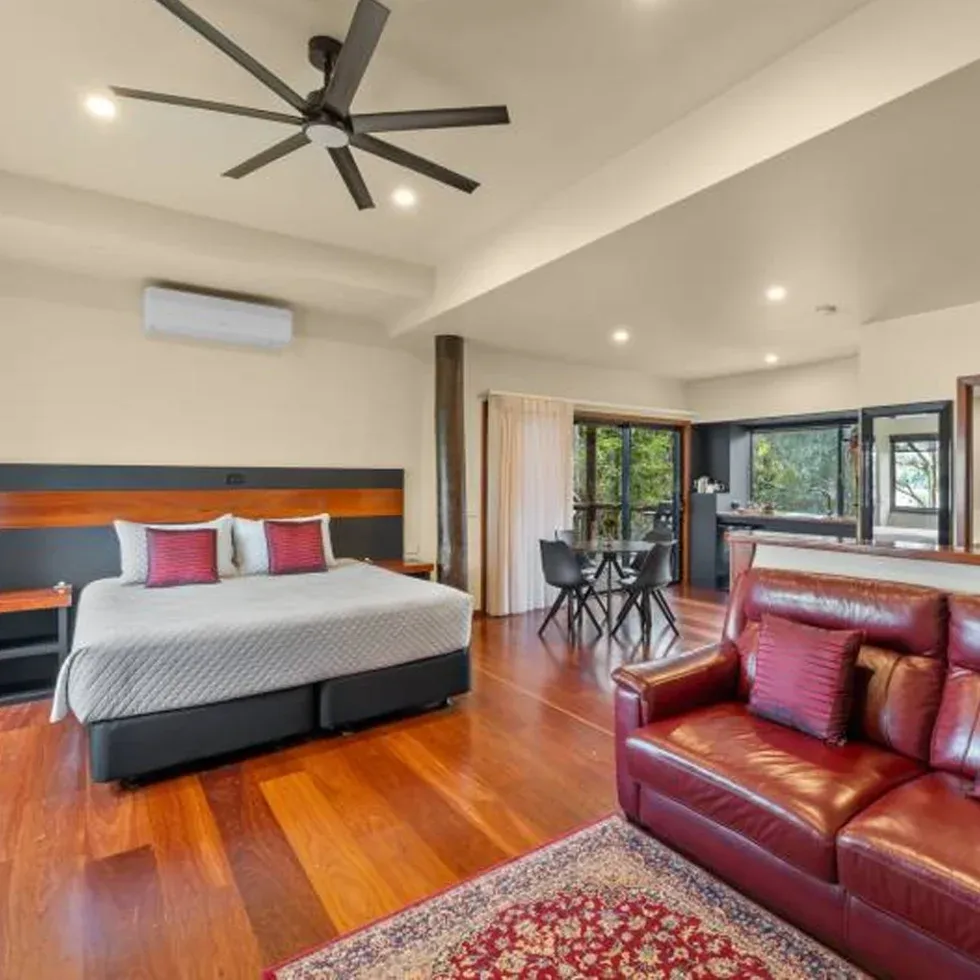 This quaint cabin includes one queen bed and two singles and is ideal accommodation for small families. The cabin is a heritage building and has it’s own unique personality.